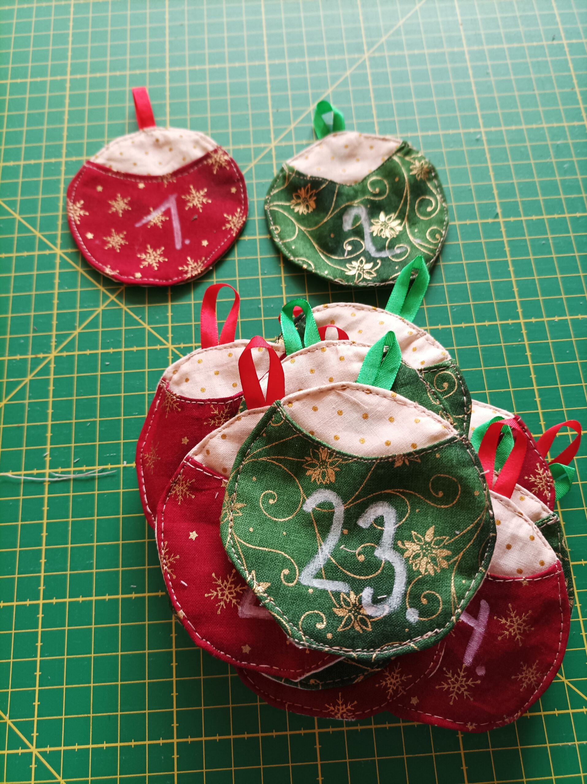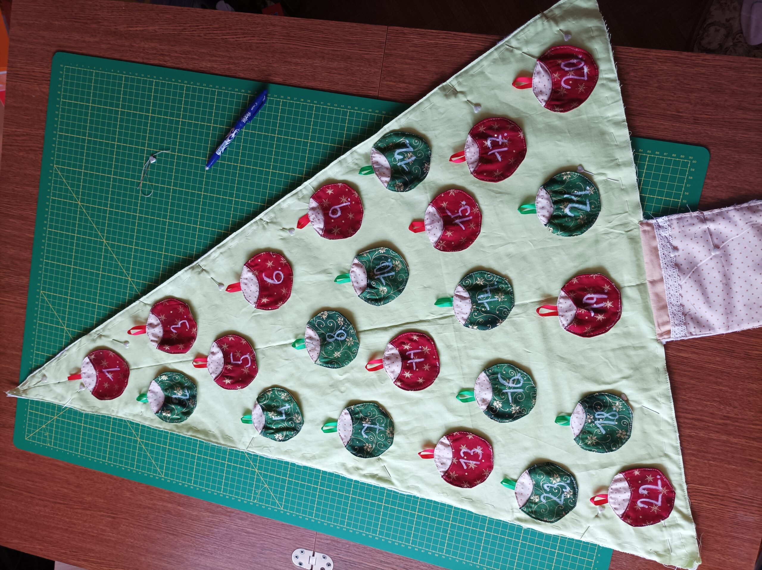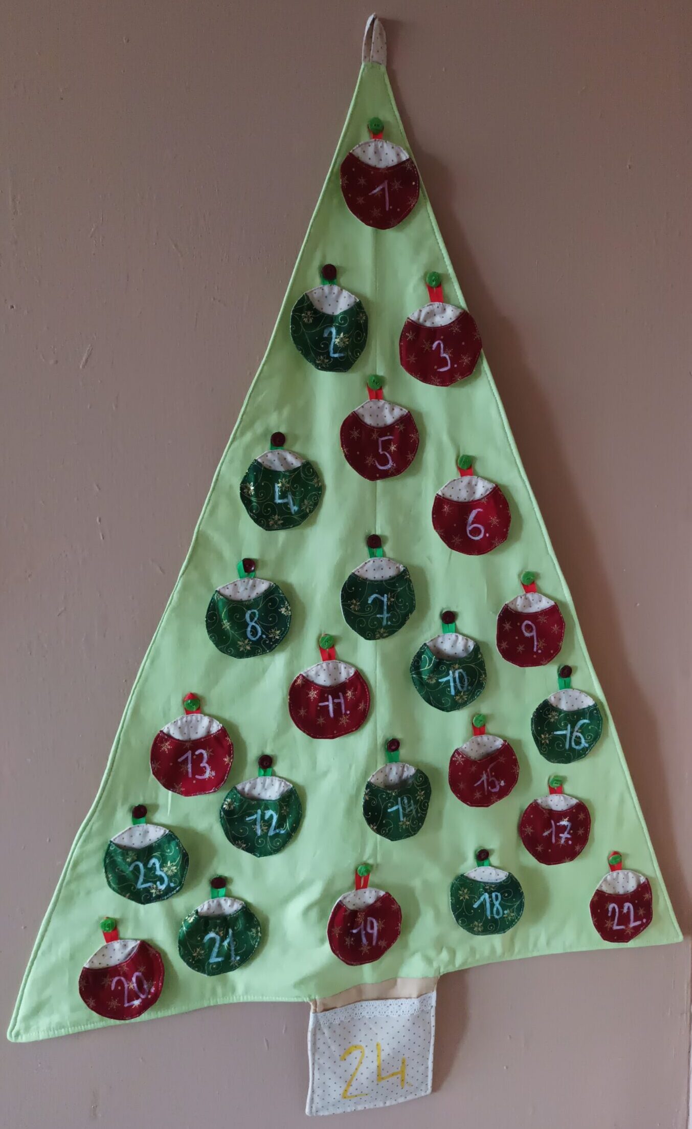 Návod v podobě PDF souboru na adventní kalendář v podobě stromečku o výšce cca 65 cm a šířce cca 79cm. Kapsičky jsou našity na kolečku o průměru 9 cm a jsou zavěšeny jako ozdoby pomocí poutek a knoflíků. Poslední kapsička s rozměry 15 cm x 27 cm s číslem 24 je umístěna na kmeni stromečku. Kapsičky jsou tudíž vhodné pro malé drobnosti. Kalendář je vhodný pro malé i velké děti.