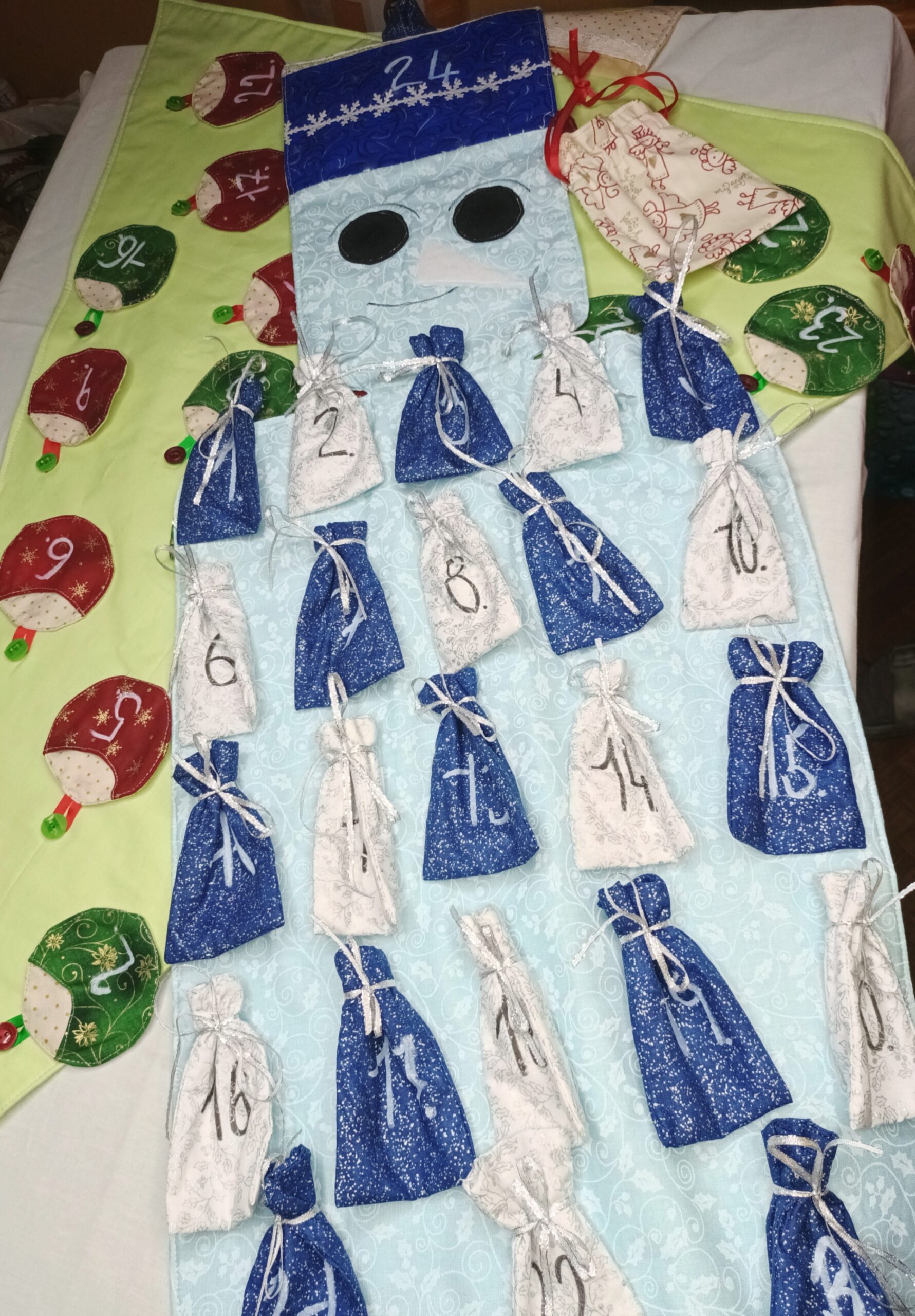 Návod na šitý adventní kalendář. Místo kapsiček jsou na adventním kalendáři pytlíčky, které jsou připevněny pomoci suchého zipu. Pytlíčky jsou široké 9 cm a vysoké 14,5 cm. Kapsa číslo 24 je umístěna na hrnci sněhuláka. Samotný sněhulák je široký 40 cm a vysoký 93 cm.